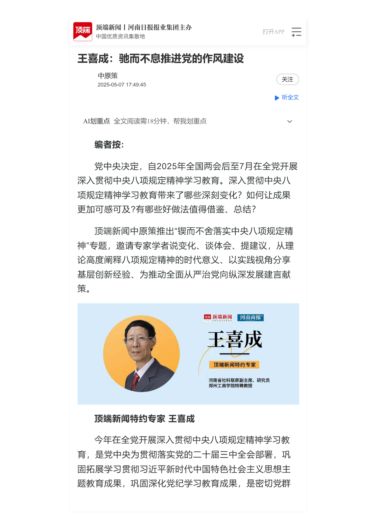 我校中原学研究院院长王喜成在“顶端新闻”发表《驰而不息推进党的作风建设》