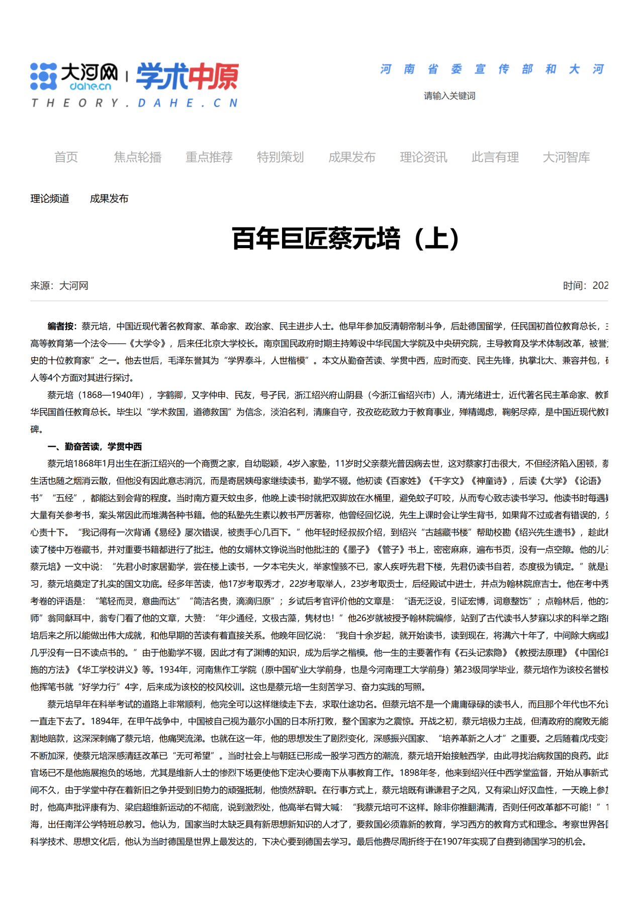 近日,郑州工商学院中原学研究院院长王喜成在“大河网”发表重磅文章《百年巨匠蔡元培(上)》,带领读者走进这位中国近现代史上杰出人物的精彩人生。