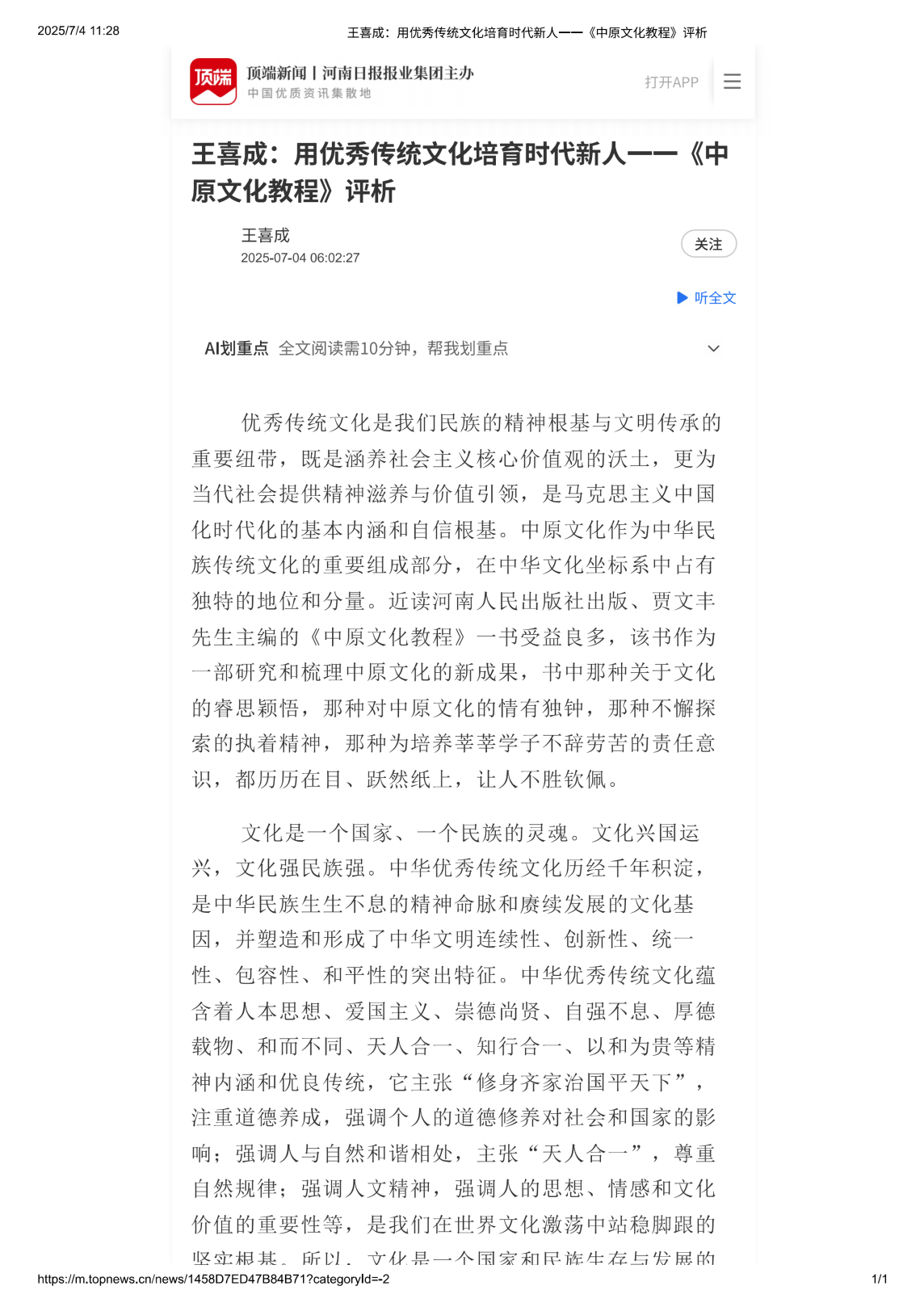 我校中原学研究院院长王喜成在“顶端新闻”发表《用优秀传统文化培育时代新人一一中原文化教程评析》